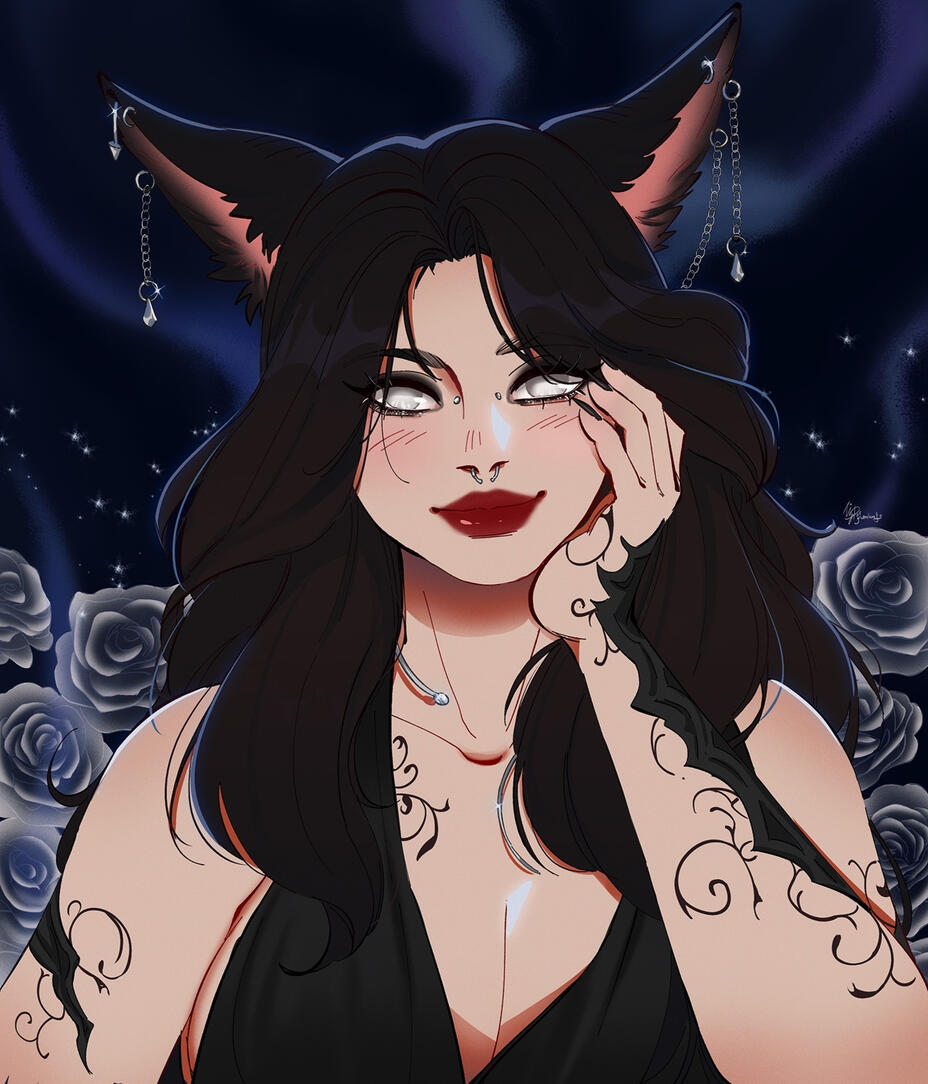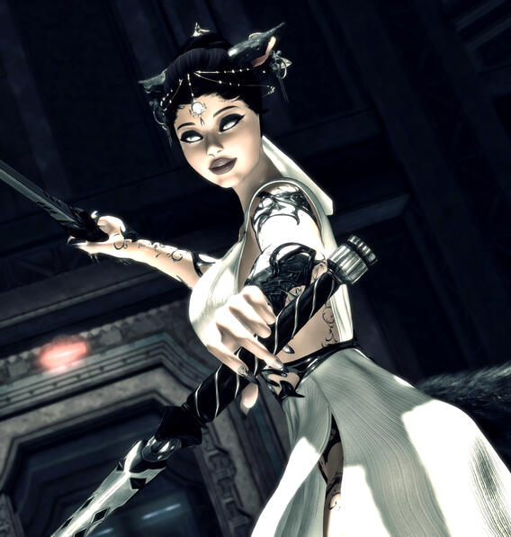 Standing at five fulms and five ilms, she is considered taller than average for a Miqo’te, her presence quietly commanding. Like her sister, her hair is naturally a deep, dark hue, worn long and often styled with subtle practicality in mind; whether pinned up for function or allowed to fall for comfort. Her full lips soften an otherwise poised expression, while her eyes, nearly devoid of visible pupils, their foggy silver irises shimmering faintly have earned her a quiet legend among Moonkeepers. Many say they mirror moonlight itself, a poetic notion she rarely disputes...Unlike her sister’s cool earthy skin, hers bears a warmer, medium-fair complexion that seems to catch light differently. She keeps her nails only slightly long. Her slim frame, balanced with an ample yet proportionate bust and hips, with toned shoulders and biceps.