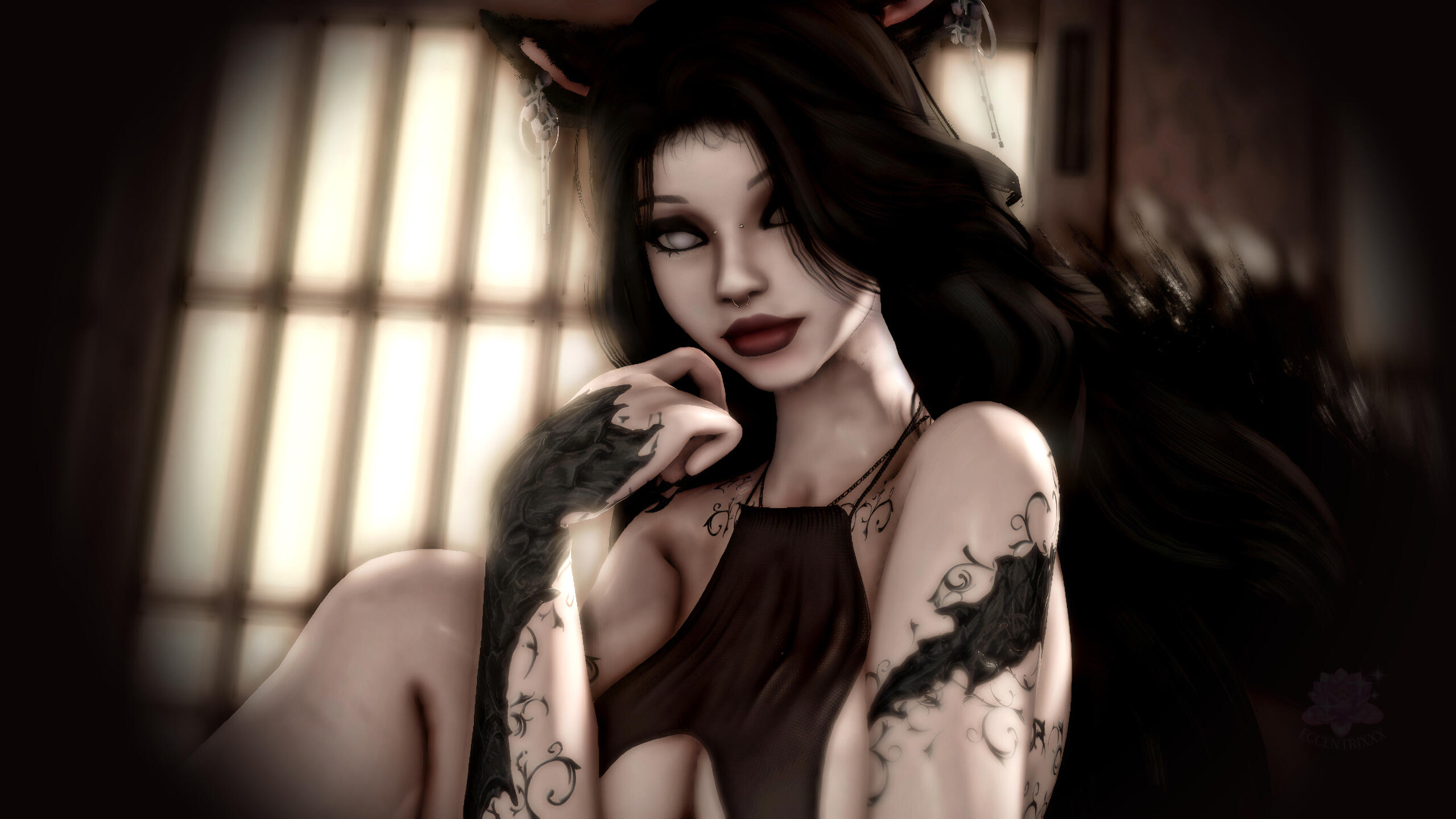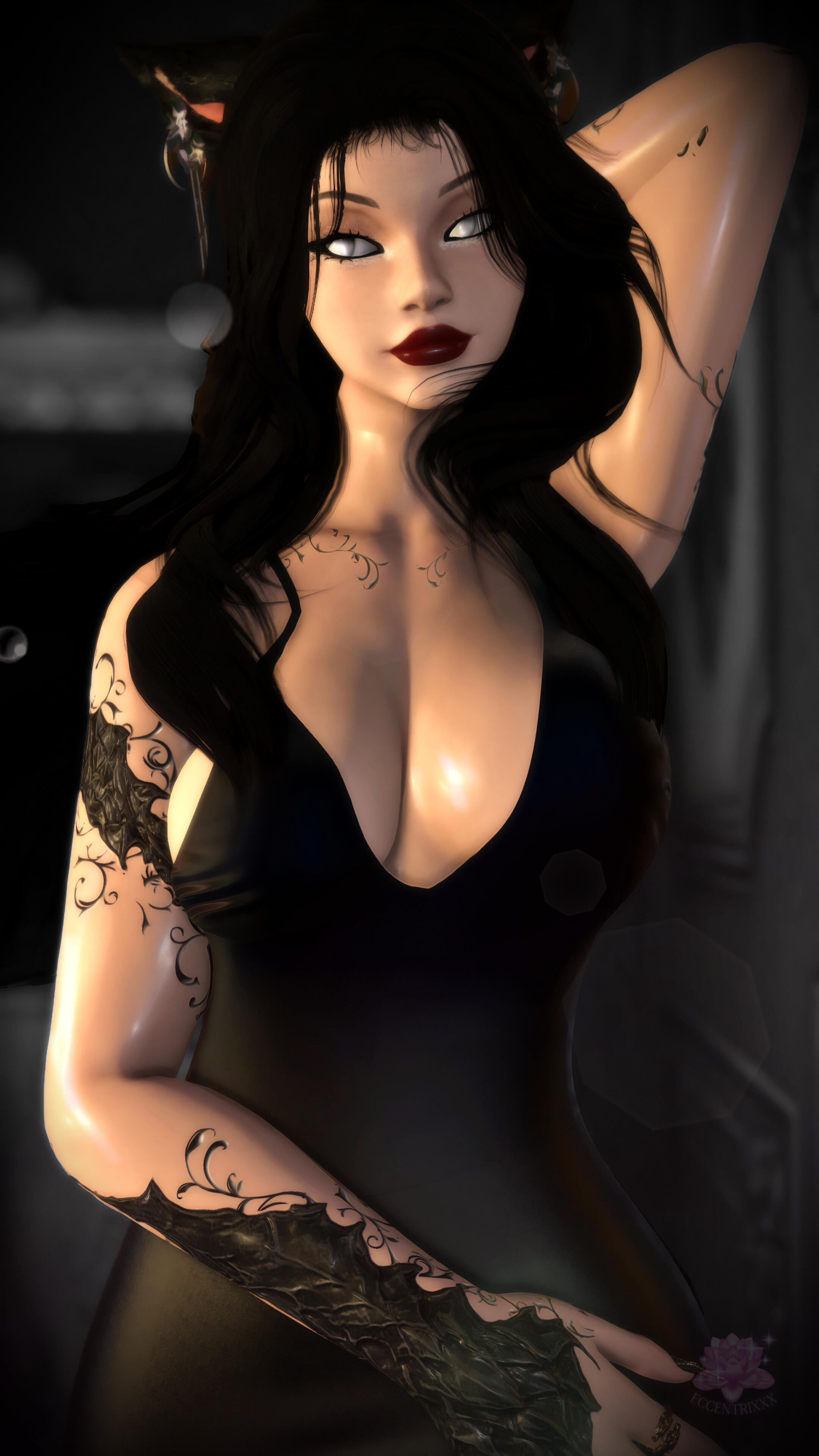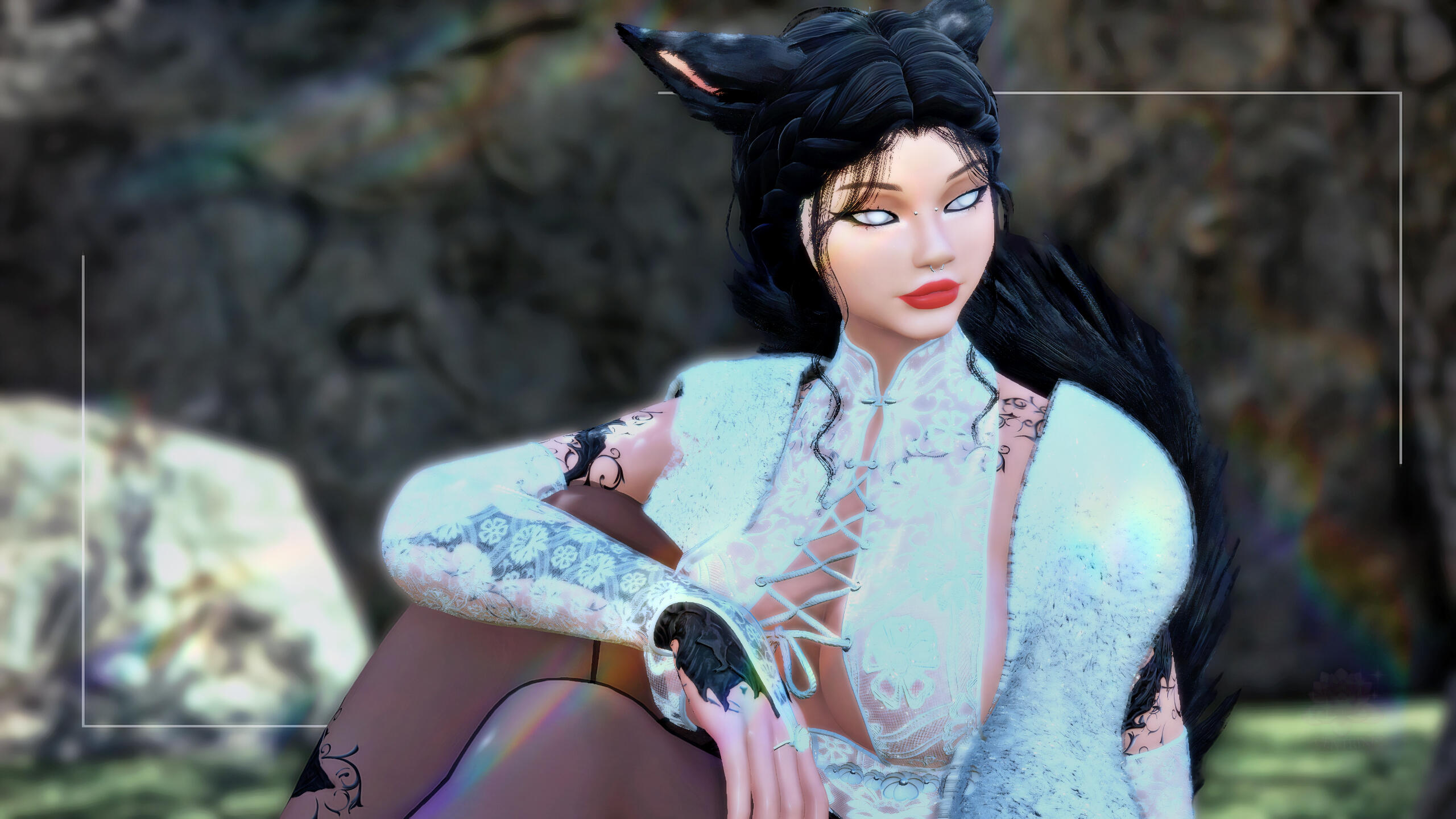 Standing at five fulms and five ilms, she is considered taller than average for a Miqo’te, her presence quietly commanding. Like her sister, her hair is naturally a deep, dark hue, worn long and often styled with subtle practicality in mind; whether pinned up for function or allowed to fall for comfort. Her full lips soften an otherwise poised expression, while her eyes, nearly devoid of visible pupils, their foggy silver irises shimmering faintly have earned her a quiet legend among Moonkeepers. Many say they mirror moonlight itself, a poetic notion she rarely disputes...Unlike her sister’s cool earthy skin, hers bears a warmer, medium-fair complexion that seems to catch light differently. She keeps her nails only slightly long. Her slim frame, balanced with an ample yet proportionate bust and hips, with toned shoulders and biceps.
