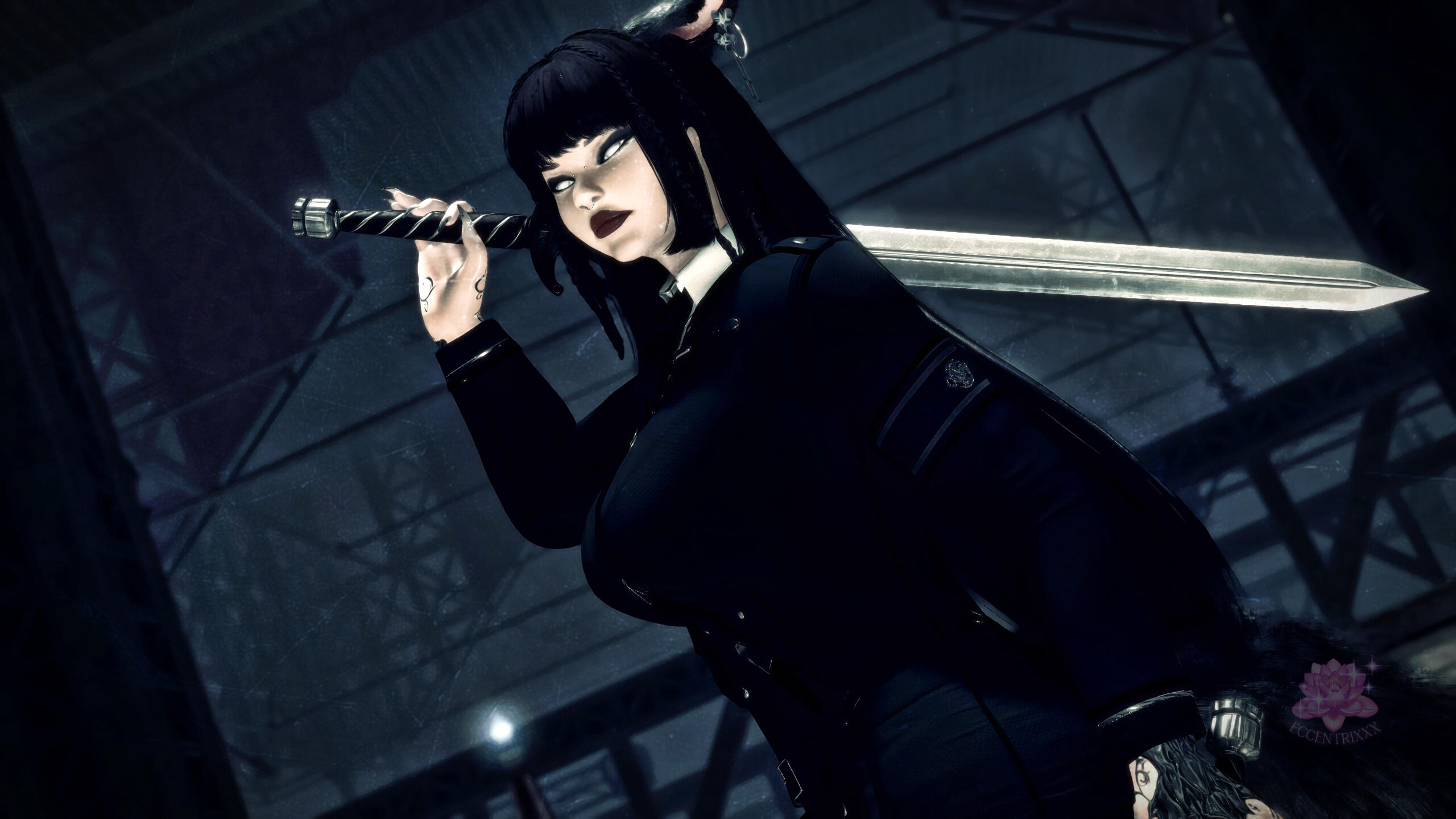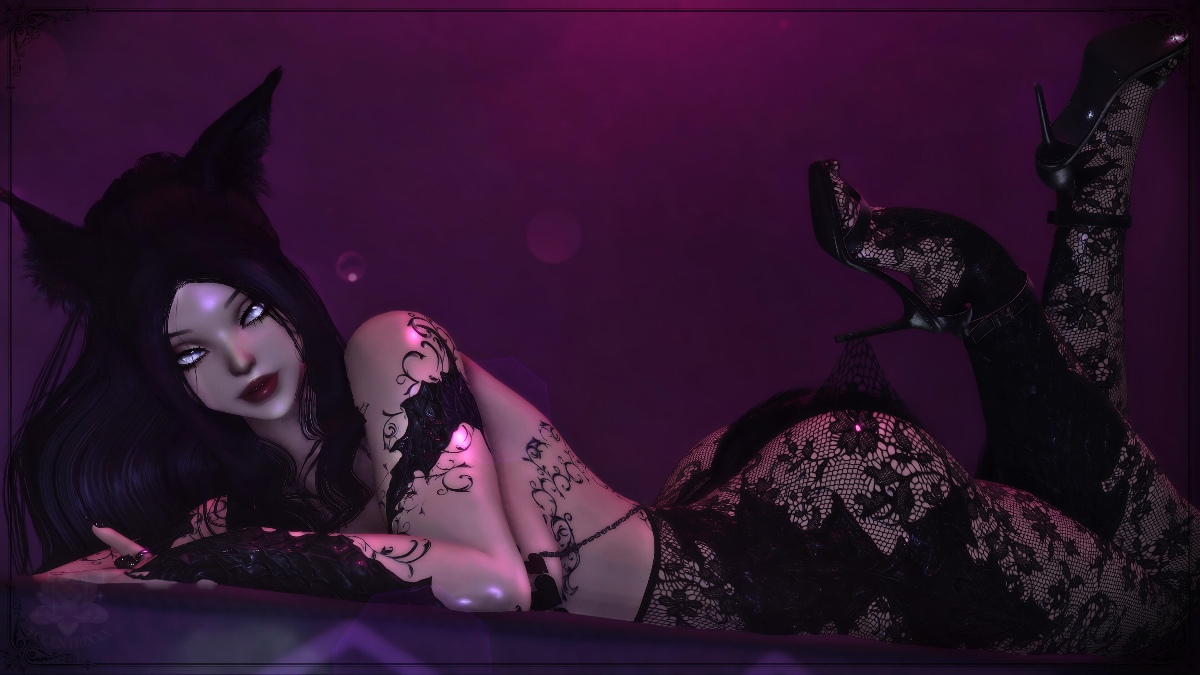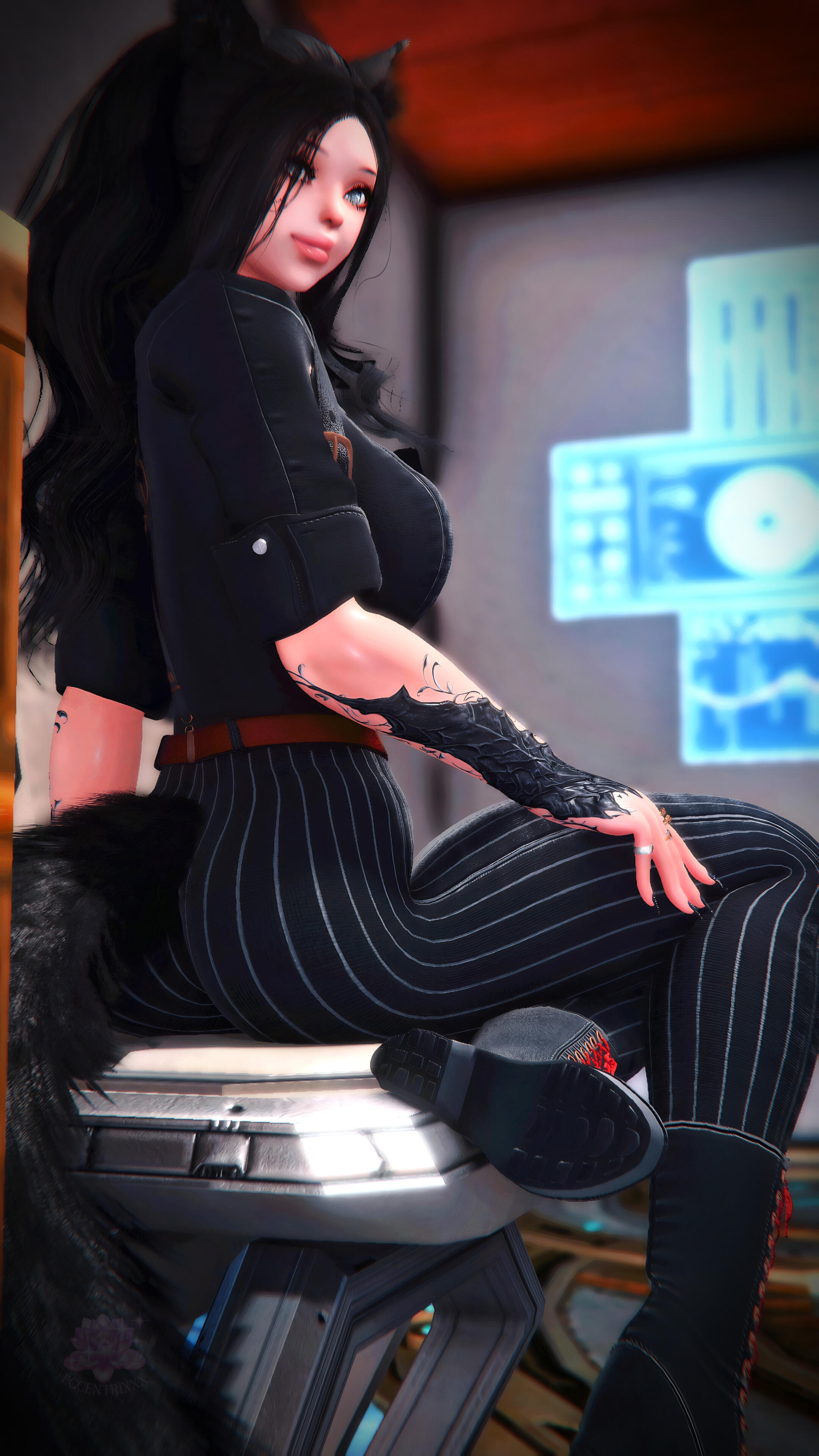 Standing at five fulms and five ilms, she is considered taller than average for a Miqo’te, her presence quietly commanding. Like her sister, her hair is naturally a deep, dark hue, worn long and often styled with subtle practicality in mind; whether pinned up for function or allowed to fall for comfort. Her full lips soften an otherwise poised expression, while her eyes, nearly devoid of visible pupils, their foggy silver irises shimmering faintly have earned her a quiet legend among Moonkeepers. Many say they mirror moonlight itself, a poetic notion she rarely disputes...Unlike her sister’s cool earthy skin, hers bears a warmer, medium-fair complexion that seems to catch light differently. She keeps her nails only slightly long. Her slim frame, balanced with an ample yet proportionate bust and hips, with toned shoulders and biceps.